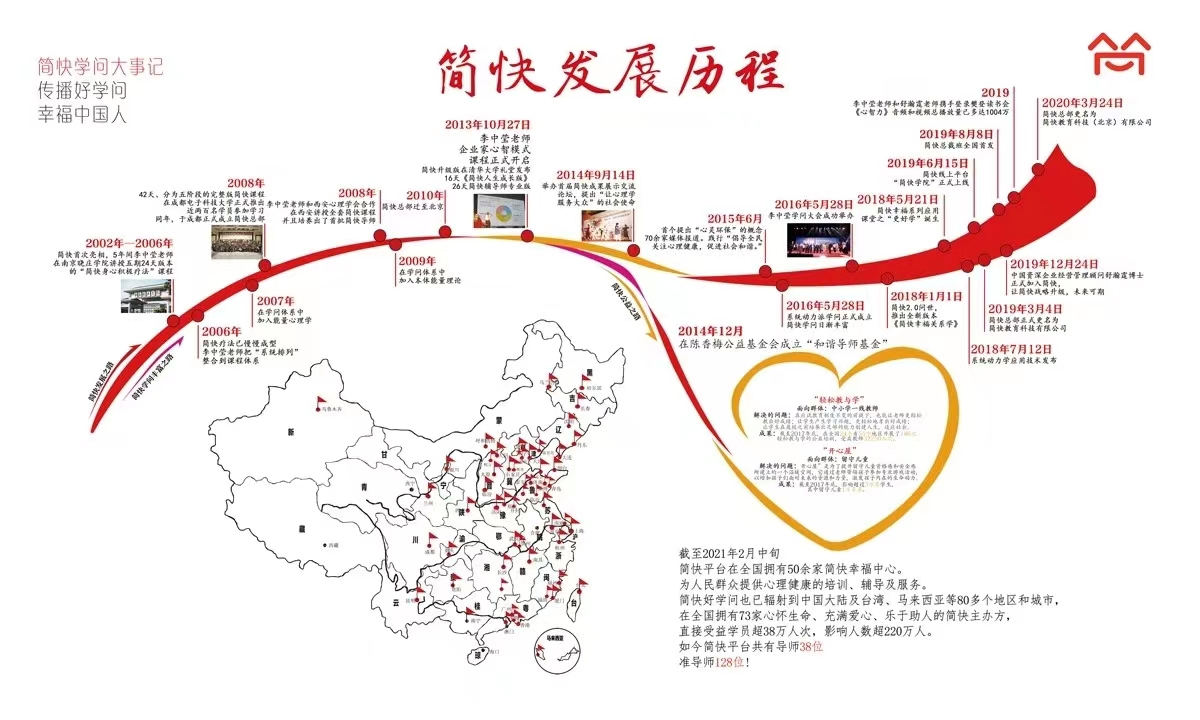 简快公司创始于2008年,在汶川大地震期间,香港后现代心理学家李中莹老师,为1500多名到灾区现场援助的心理工作者,做了“社会性集体创伤辅导技巧”培训后取得强烈反响,为更好的响应需求服务国人,简快公司在成都应运而生,后迁至北京。